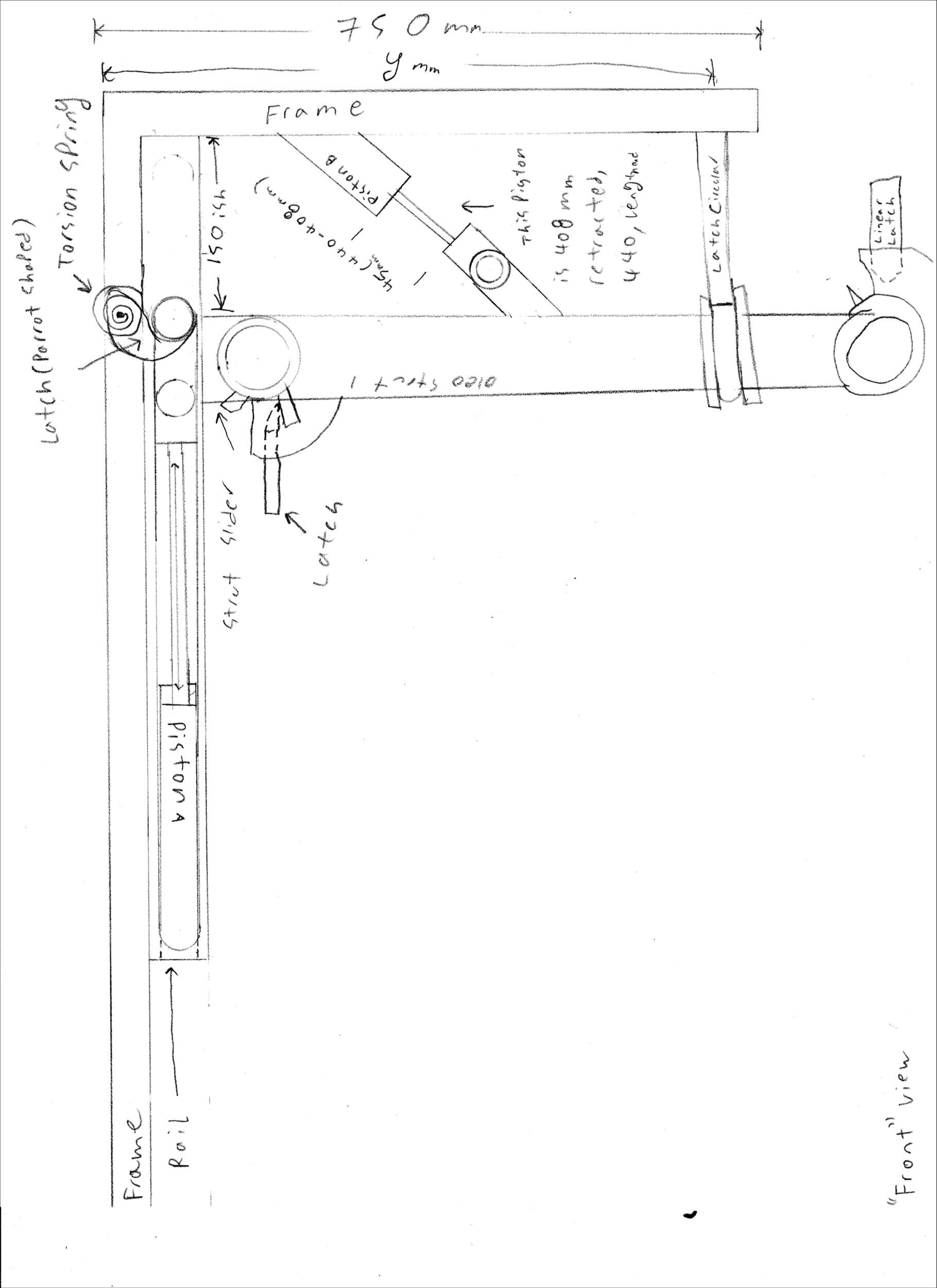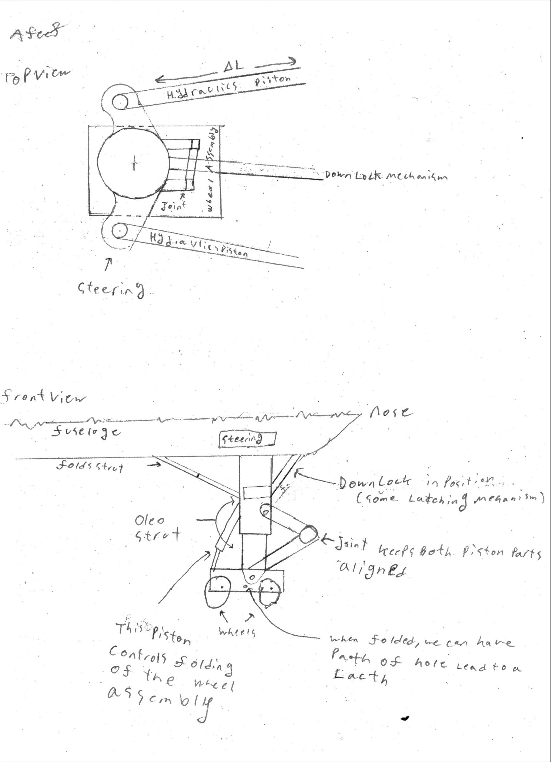 Initial research was done through current landing gear systems and other literature sources for certain components of the system. Sketches were made for the initial design of the mechanism for the landing gear to see how each part had to be designed and how they're going to interact with other parts within the mechanism. It was also decided that the cage the whole landing gear mechanism had to fit within was 1.5m x 1.0m x 0.75m.